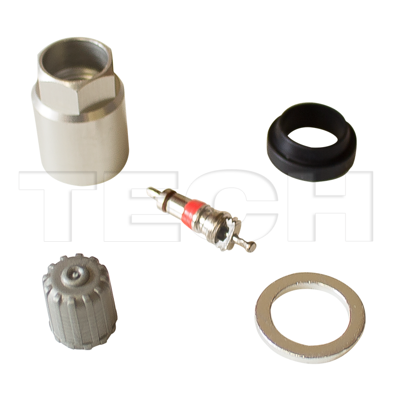 A box of 10 service kits with each including: 1 nut, 1 rubber grommet, 1 metal washers, 1 screw, 1 valve core, and 1 valve cap