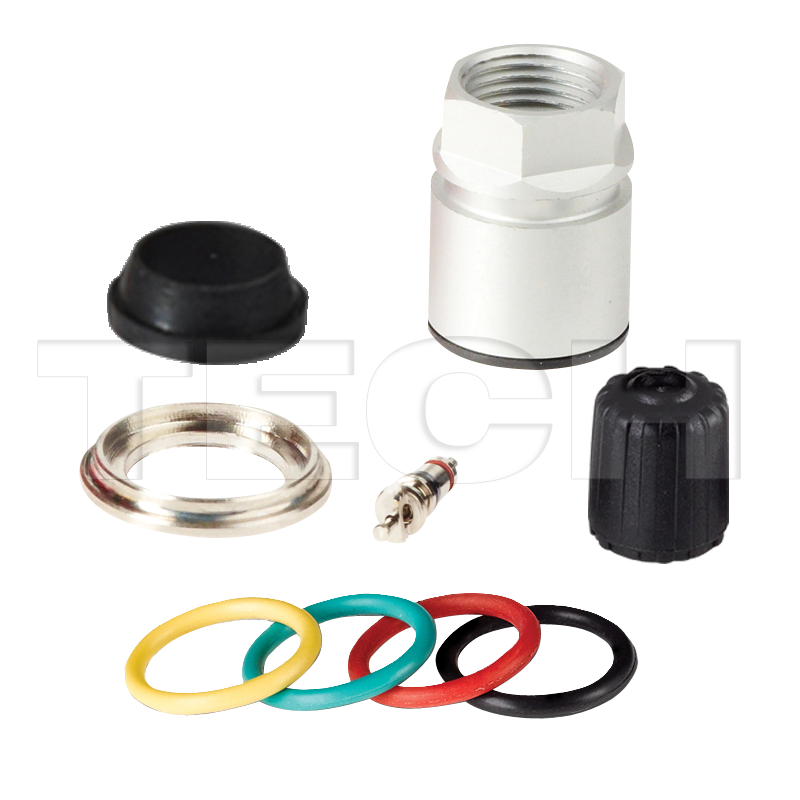 A box of service kits, with each including: 1 nut, 1 rubber grommet, 1 plastic washer, 1 valve cap and 1 valve core.
