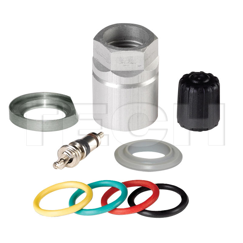 A box of service kits, with each including: 1 nut, 1 rubber grommet, 1 plastic washer, 1 valve cap and 1 valve core.